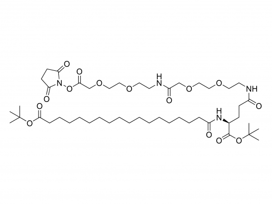 • Structure includes stearic acid with tert-butyl protection, glutamic acid core, two PEG-like AEEA units forming a hydrophilic spacer, and terminal NHS ester.